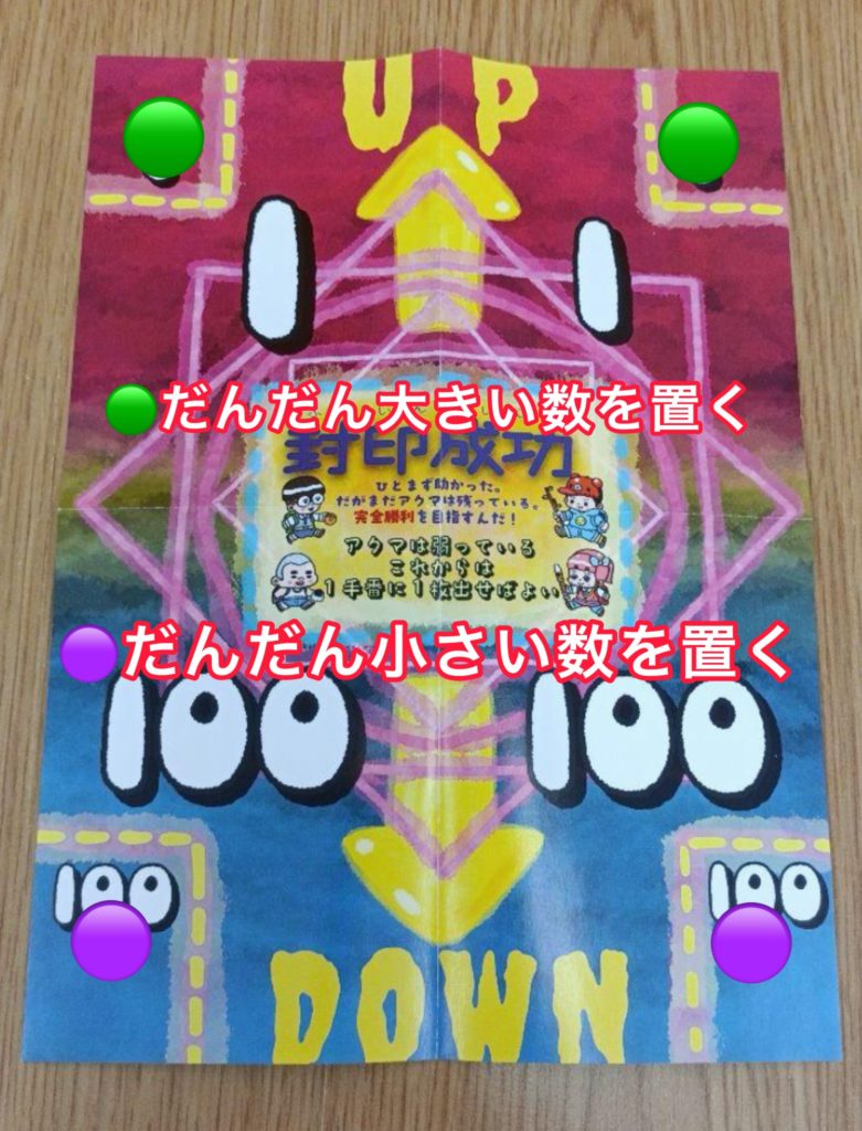 - 「UP」2列(緑〇):既に置かれている数字より大きい数字のみ置ける(昇順)
