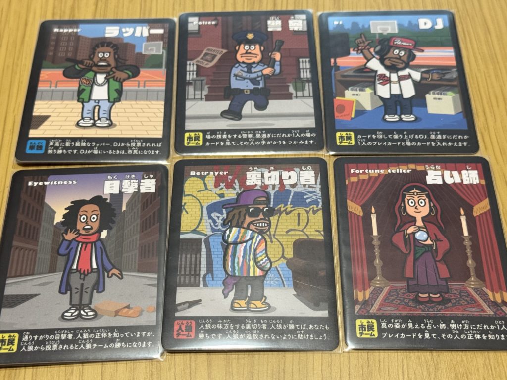 • 6人:人狼2、裏切り者1、市民5、占い師1、警察1、DJ1、おばけ1