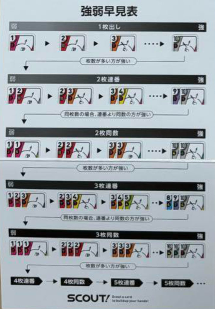 - 場に出ているカードをスカウト(手札に加える)する際、それを手札の並びのどこに入れるかという処理に、慣れないうちは戸惑うことがあります。