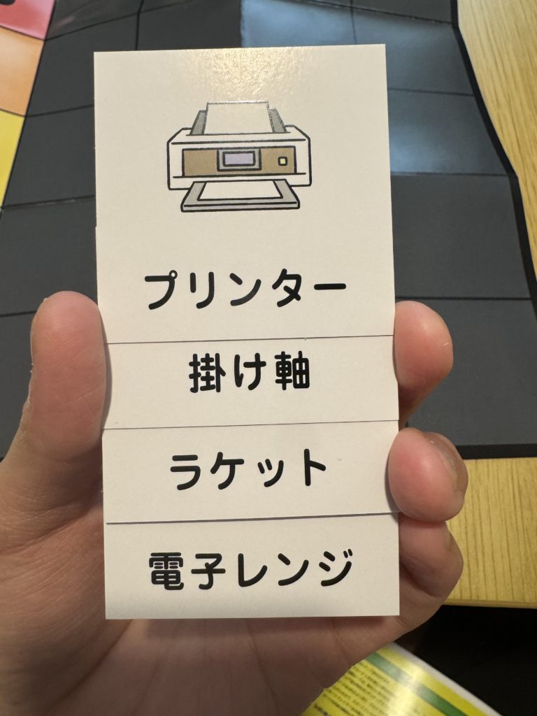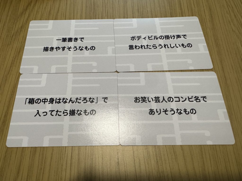 - テーマがゆるく、「無人島であったら嬉しいもの」「人の名前でありそうなもの」などお題も軽めなので、幅広い年齢層・雰囲気で楽しめる。