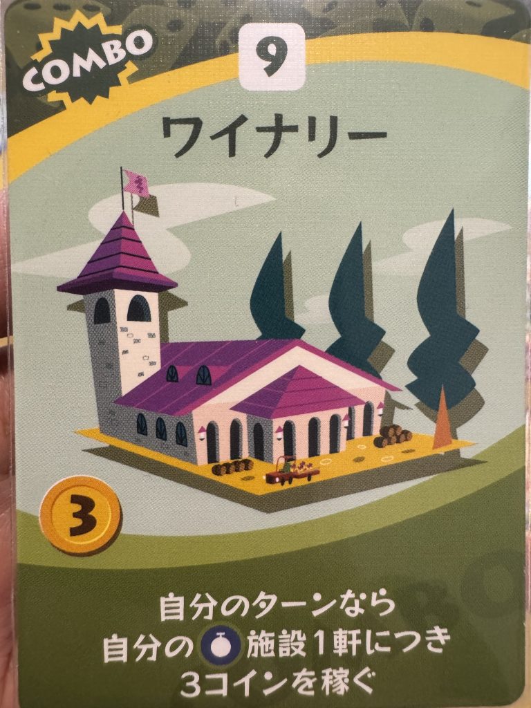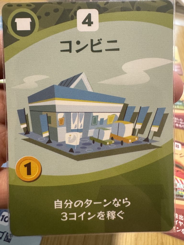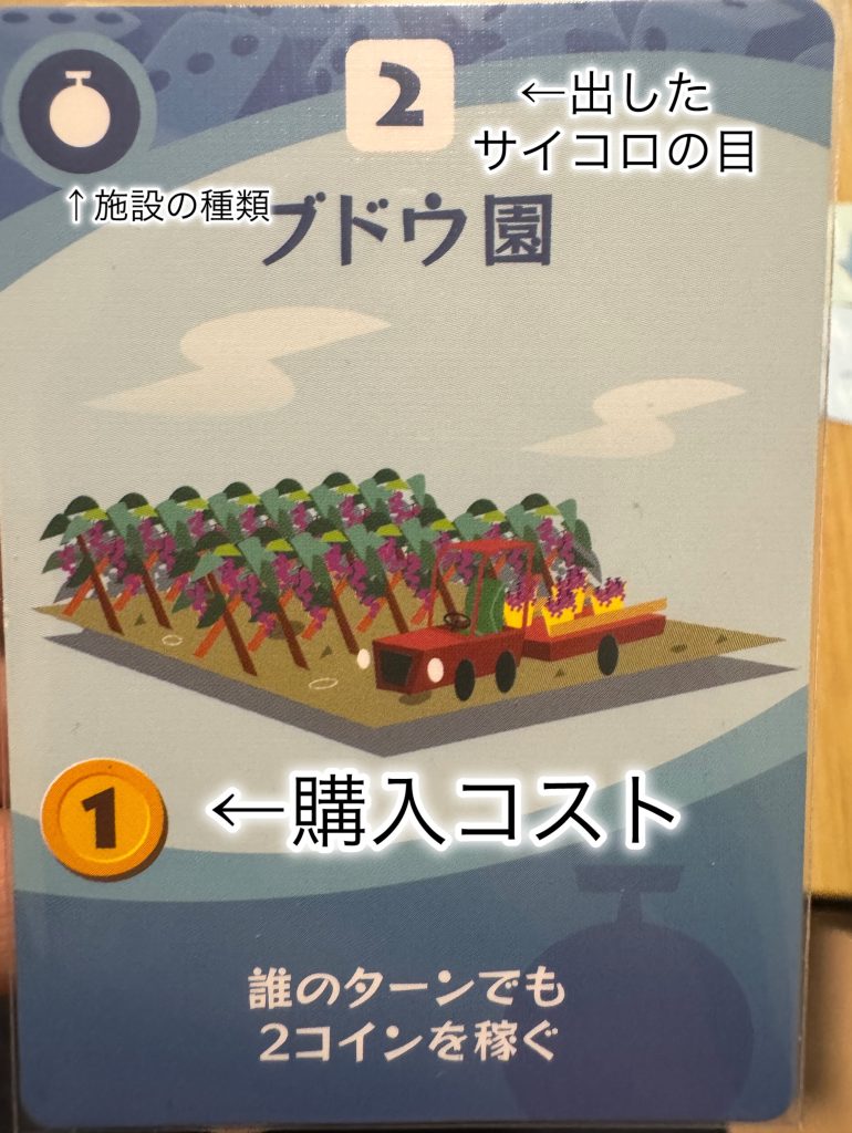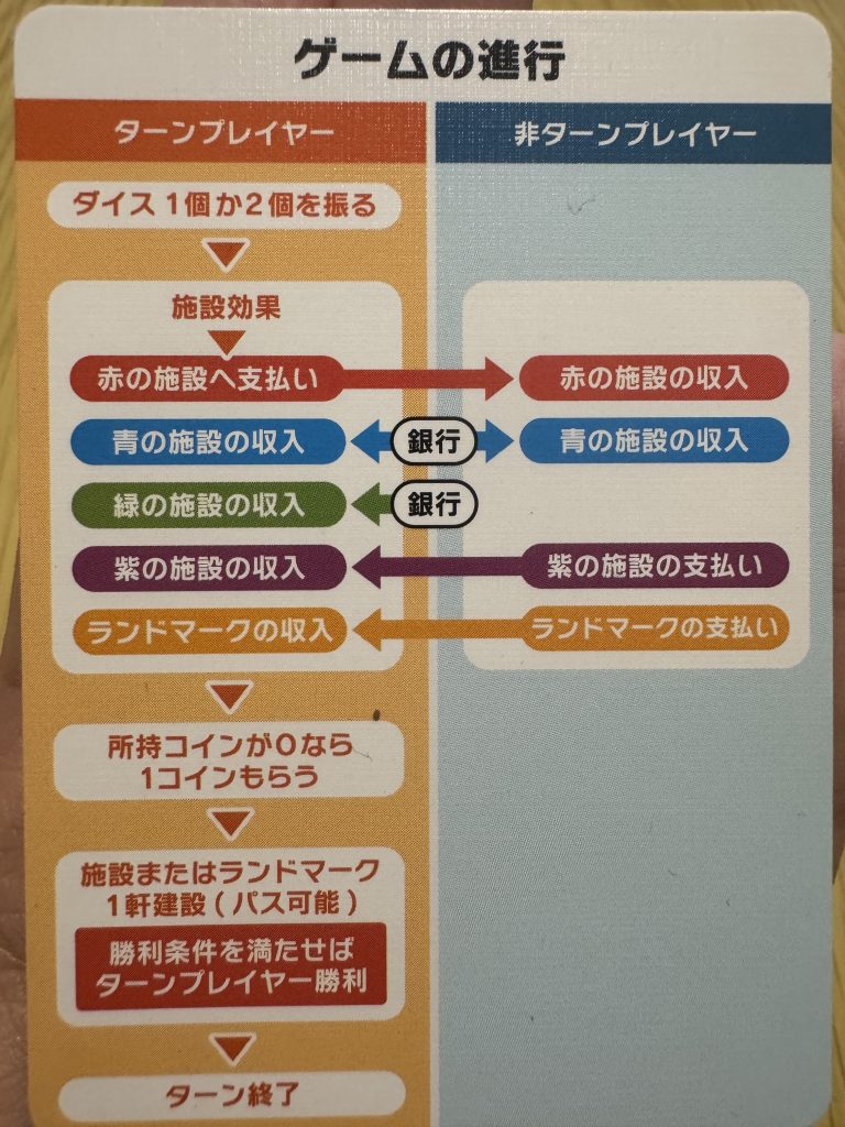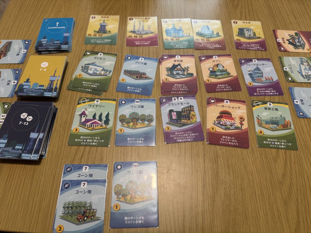 施設カードをシャッフルし、施設を15種類並べる。なくなったら補充。 - 購入タイムを3周行う。(お金が無くなったら買えない)