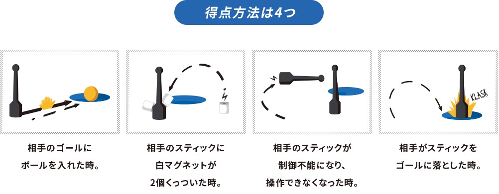 - 相手のストライカーに白マグネットが2個以上くっつく。