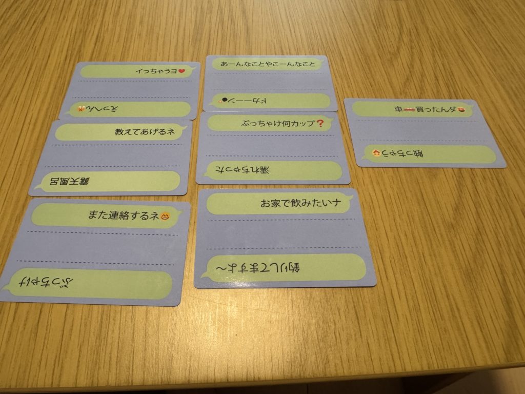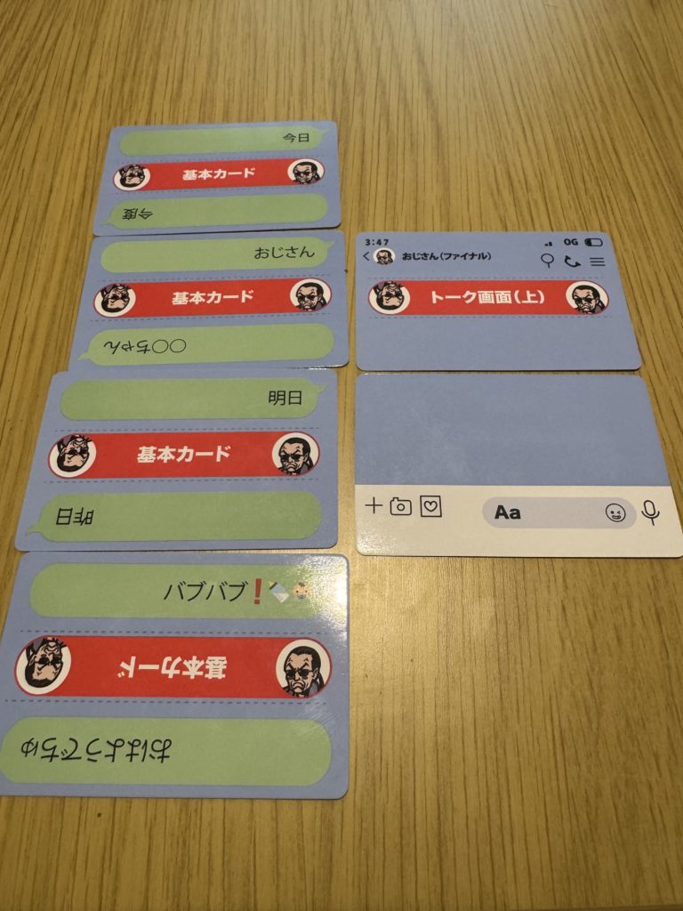 - 手札のカードを組み合わせて、おじさん構文らしい“気持ち悪い”メッセージを作成。
